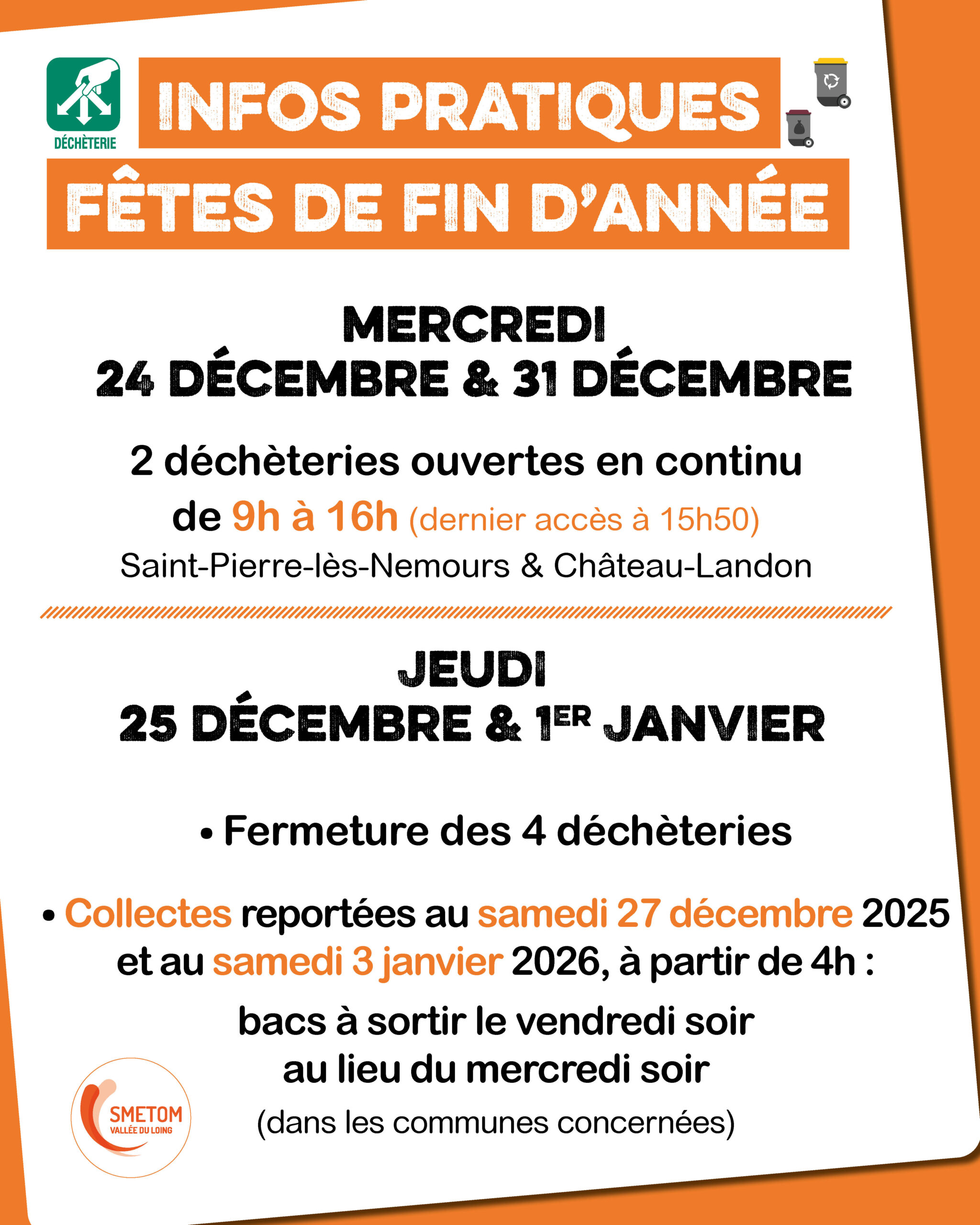 𝐌𝐞𝐫𝐜𝐫𝐞𝐝𝐢 𝟐𝟒 𝐞𝐭 𝟑𝟏 𝐝é𝐜𝐞𝐦𝐛𝐫𝐞 𝟐𝟎𝟐𝟓 Les déchèteries Saint-Pierre-lès-Nemours et Château-Landon seront ouvertes de 9h à 16h, en continu. Les déchèteries de Chaintreaux et La Chapelle-la-Reine seront fermées comme tous les mercredis. Les collectes auront lieu normalement sur les communes concernées. Comme d’habitude, pensez à sortir vos bacs la veille au soir. 𝐉𝐞𝐮𝐝𝐢 […]