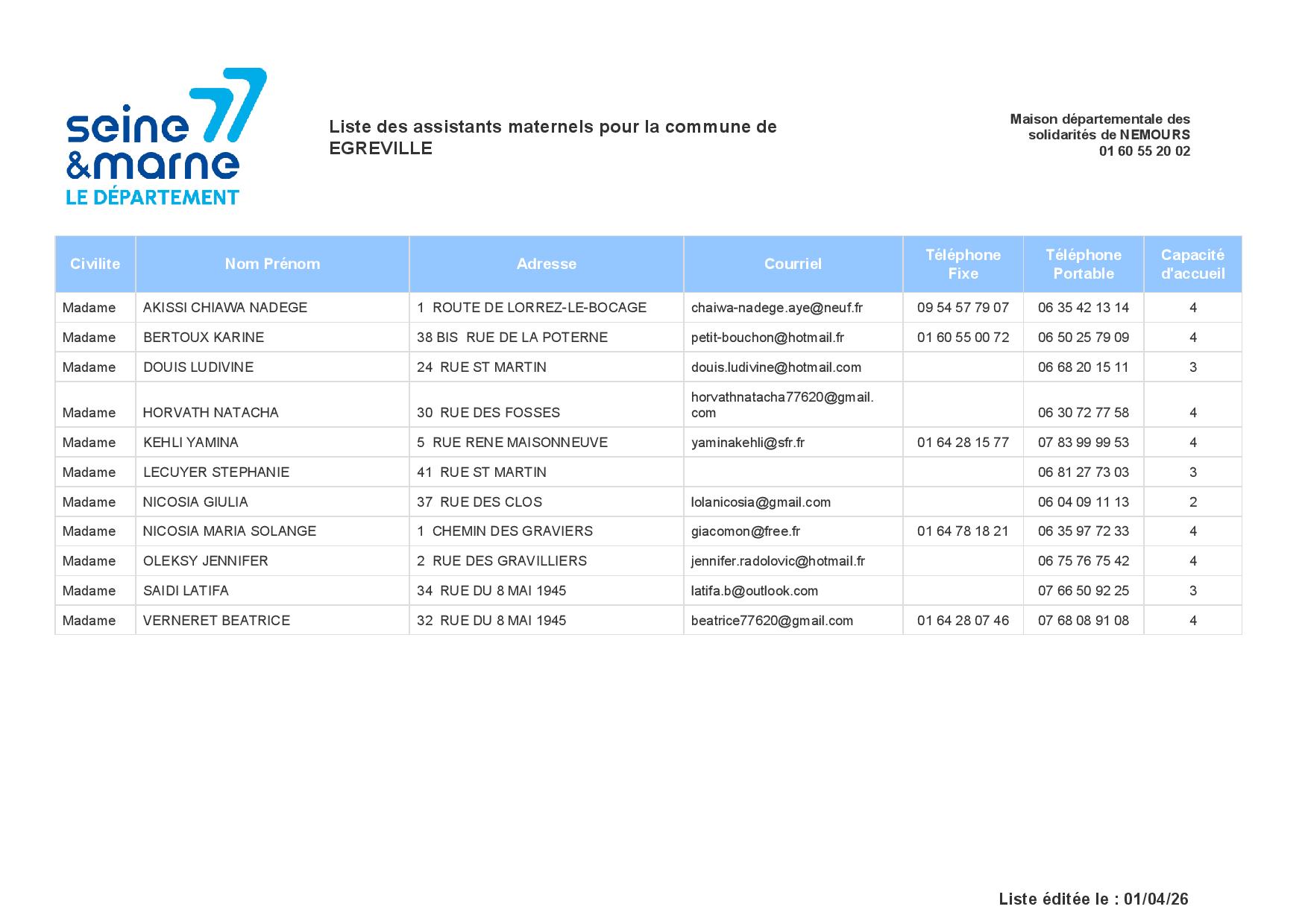 Liste des assistantes maternelles sur la commune d’Egreville. **Mise à jour Avril 2026*